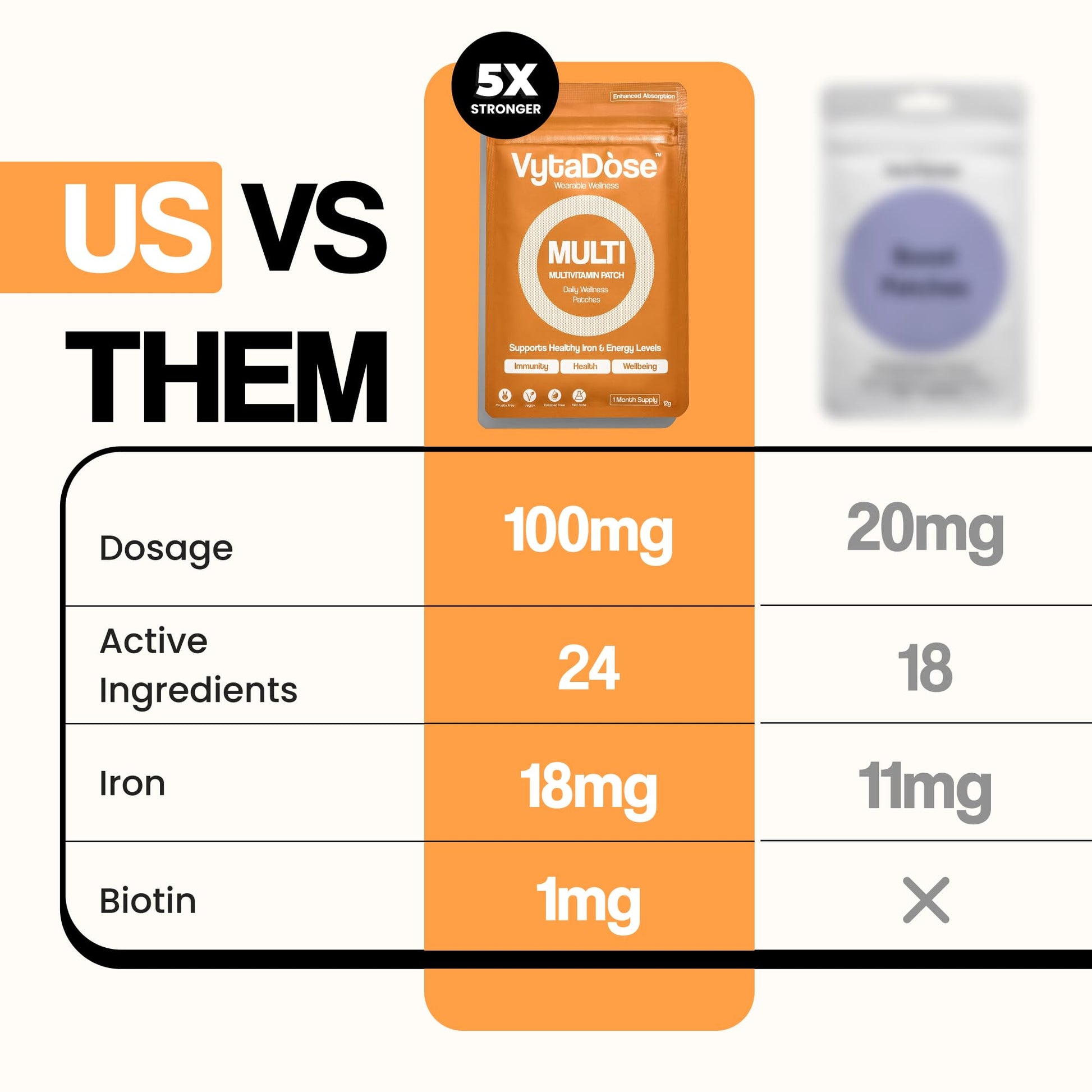 - COMPLETE IRON, BIOTIN & MULTIVITAMIN PATCHES: Our multivitamins for women patch delivers 100% RDI iron, 26 essential vitamins and comprehensive minerals for energy, immunity, and wellness. Provides steady iron and womens vitamins over 8-12 hours.