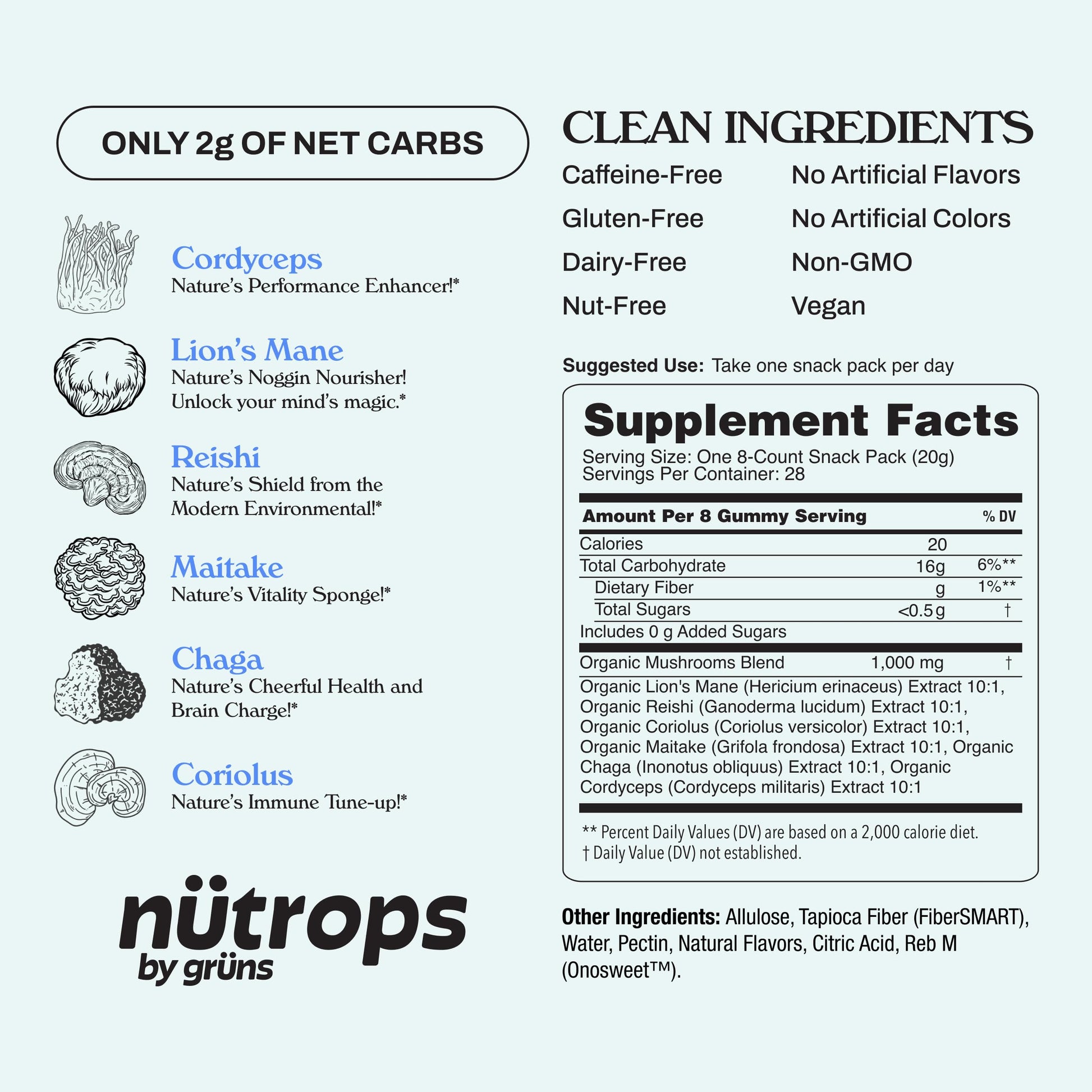 - Comprehensive Nutrition for Brain Health: Gruns Nutrops are formulated with six types of mushrooms to support overall cognitive health. These refreshing Lemon flavored gummies are designed to enhance focus, promote mental clarity, support memory, and tackle the afternoon slump. Pair Nutrops with our Supergreens Gummy Bears for a total of 12g of dietary fiber for complete support.
